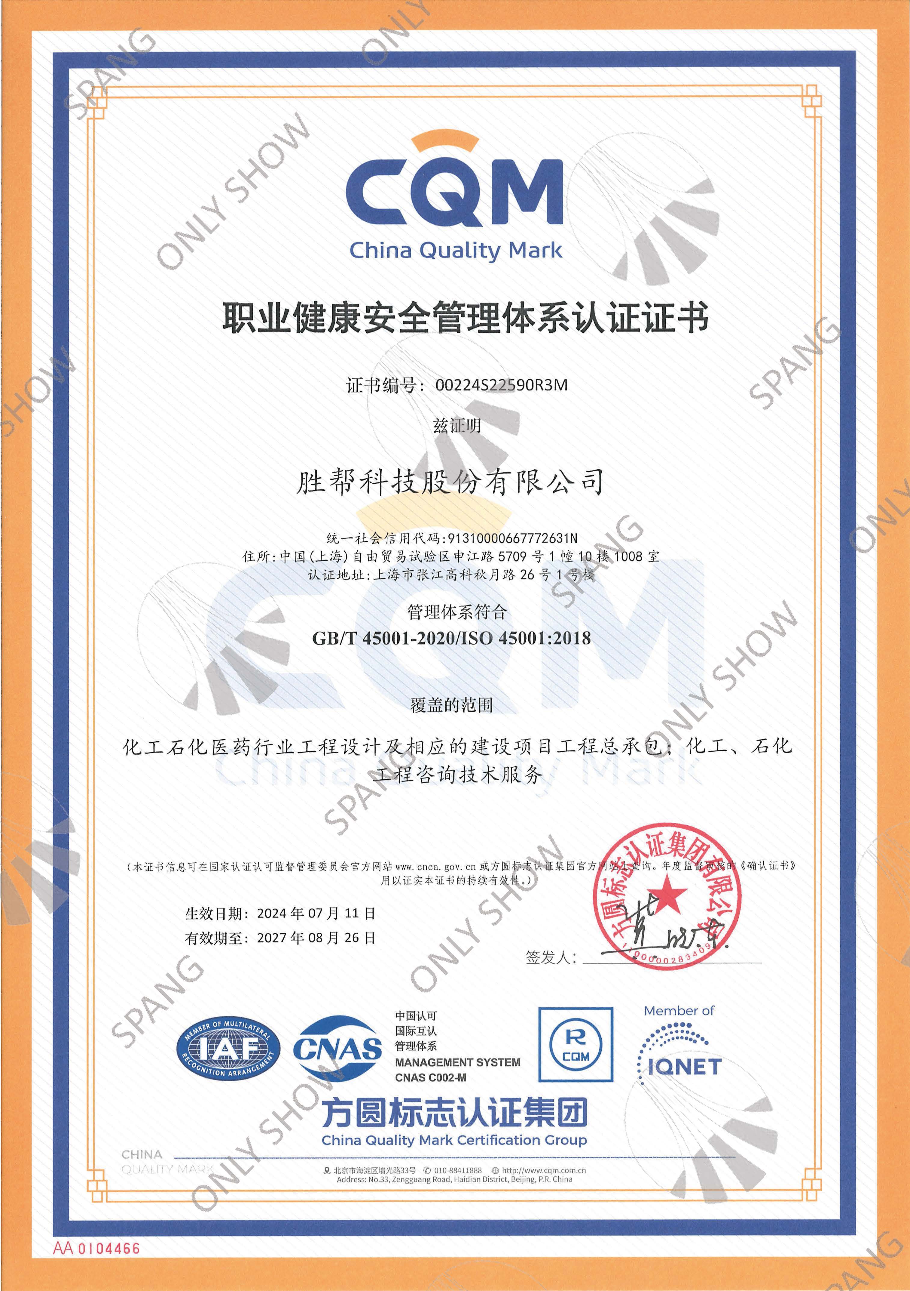 职业健康安全管理体系证书(英文版)-国际通用