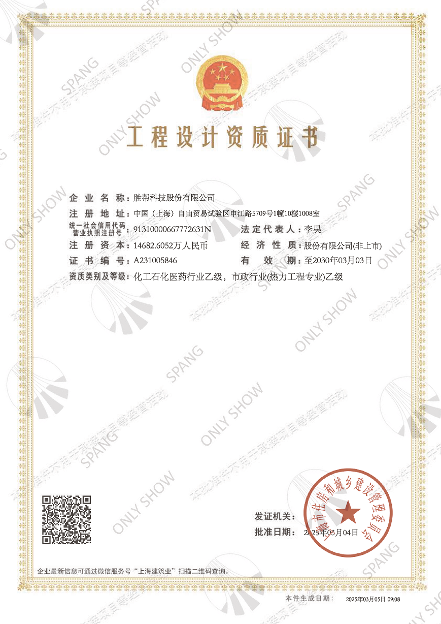工程设计资质证书(化工石化医药行业乙级,市政行业(热力工程专业)乙级)