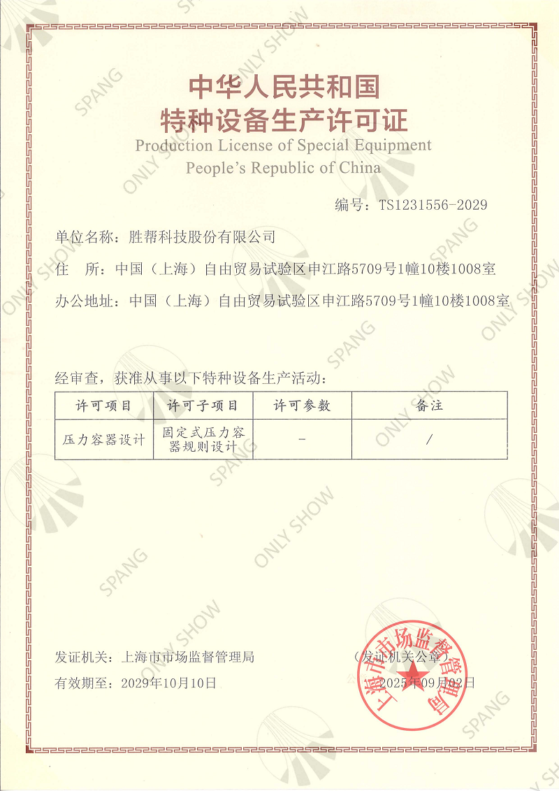 近日,胜帮科技喜获由上海市市场监督管理局颁发的特种设备生产许可证(压力容器设计)新证书。特种设备生产许可证(压力容器设计)四年换证一次,自2009年首次取证后,历经三次换证,本次已是公司第四次成功换证。